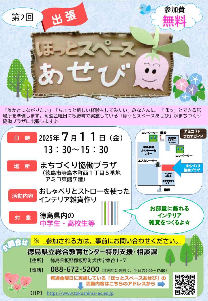 現在、毎週金曜日、板野町にある徳島県立総合教育センターで実施している「ほっとスペースあせび」を、まちづくり協働プラザ(アミコ東館7階)で実施します。